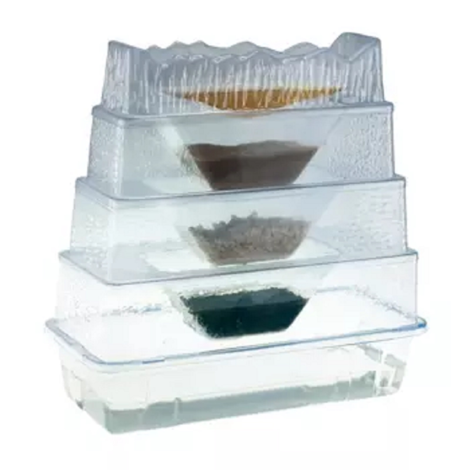 Marca EDU TOYS 1 filtración, 3 bolsas de grava de 65g, 3 bolsas de arena de 65g 1 carbón activo de 90g, papel de filtro tamaño A4 1 taza de medir de 50ml y unos lentes de seguridad.