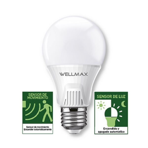 Marca WELLMAX Modelo: Light + Motion sensor A60 Potencia: 9W Lúmenes: 810lm Tensión nominal: 220-240V Frecuencia: 50/60hz Batería: 75mA Factor de potencia: 0.5 Base: E27.